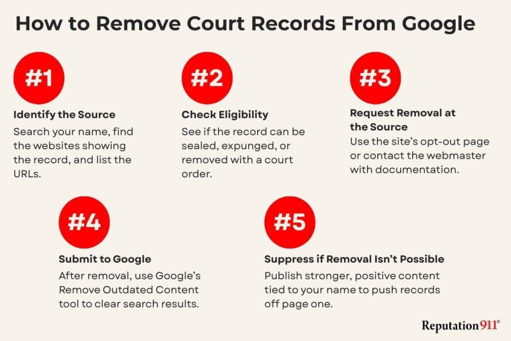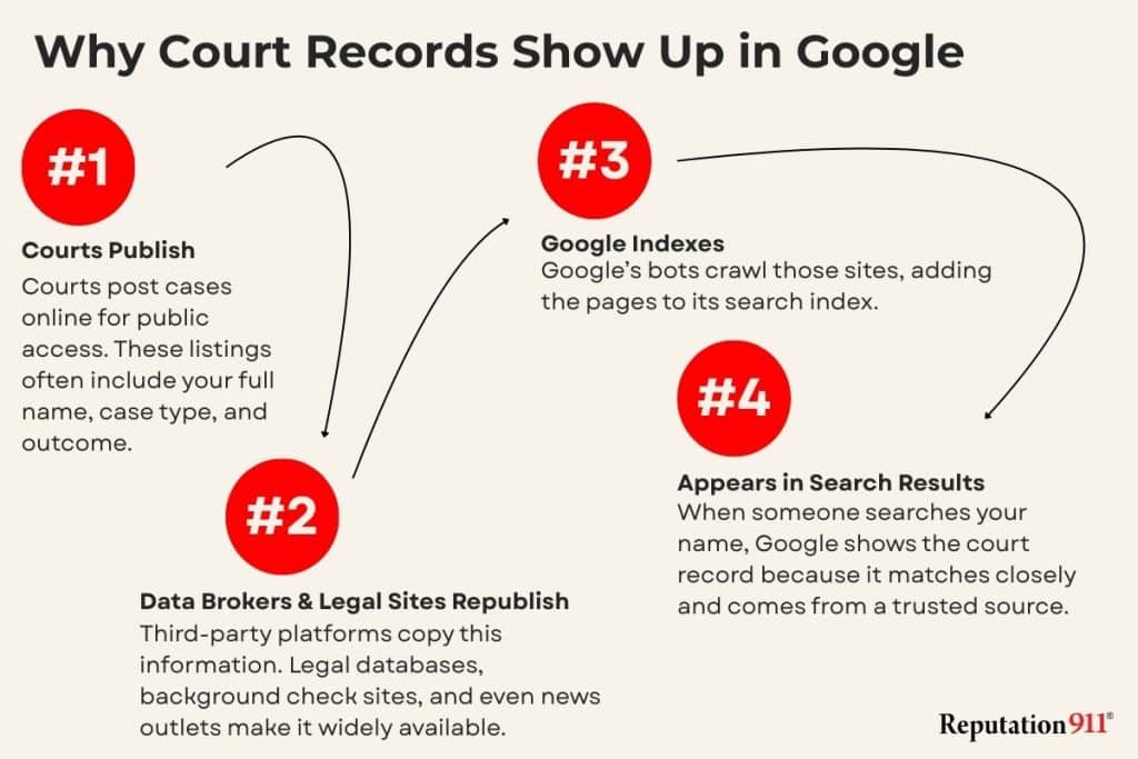 Google doesn’t host court records—it pulls them from court websites, legal databases, and data brokers. To remove them, you need to request removal at the source (through sealing, expungement, or a site’s opt-out process).